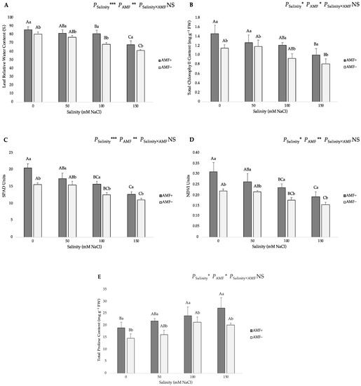 Effects of arbuscular mycorrhizal fungi (AMF) inoculation on (A) leaf relative water content, (B) total chlorophyll content, (C) soil plant analysis development (SPAD), (D) natural difference vegetation index (NDVI), and (E) total proline content in leaves of flax at different salinity (0, 50, 100, and 150 mM NaCl) levels. AMF+: with AM inoculum; AMF−: without inoculation. NS: No significant effect; *, ** and ***: Significant at 5%, 1% and 0.1% probability levels, respectively. Values are means ± standard error. The different capital letters indicate significant differences among different salinity levels, and the different lowercase letters for the same salinity level indicate significant differences among different AMF inoculation treatments according to Tukey’s HSD test (p ≤ 0.05).