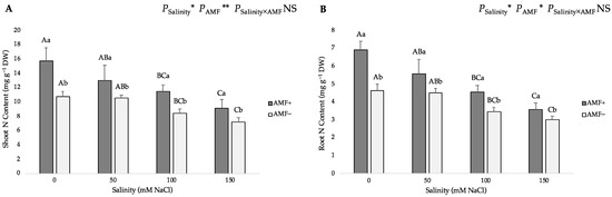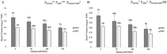 Effects of arbuscular mycorrhizal fungi (AMF) inoculation on (A) shoot nitrogen (N) content, (B) root N content, (C) shoot phosphorus (P) content, and (D) root P content of flax at different salinity (0, 50, 100, and 150 mM NaCl) levels. AMF+: with AM inoculum; AMF−: without inoculation. NS: No significant effect; *, ** and ***: Significant at 5%, 1% and 0.1% probability levels, respectively. Values are means ± standard error. The different capital letters indicate significant differences among different salinity levels, and the different lowercase letters for the same salinity level indicate significant differences among different AMF inoculation treatments according to the Tukey’s HSD test (p ≤ 0.05).