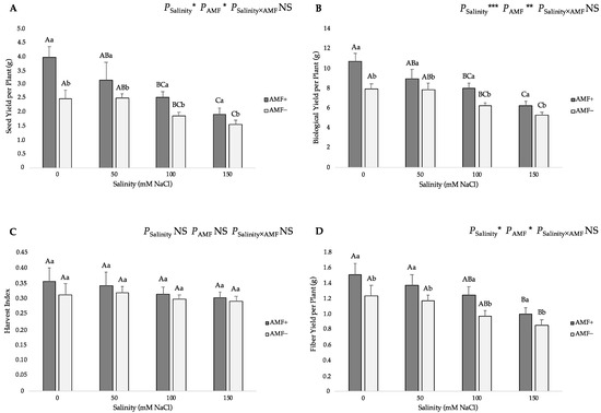 Effects of arbuscular mycorrhizal fungi (AMF) inoculation on (A) seed yield per plant, (B) biological yield per plant, (C) harvest index, and (D) stem fiber yield per plant of flax at different salinity (0, 50, 100, and 150 mM NaCl) levels. AMF+: with AM inoculum; AMF−: without inoculation. NS: No significant effect; *, ** and ***: Significant at 5%, 1% and 0.1% probability levels, respectively. Values are means ± standard error. The different capital letters indicate significant differences among different salinity levels, and the different lowercase letters for the same salinity level indicate significant differences among different AMF inoculation treatments according to the Tukey’s HSD test (p ≤ 0.05).