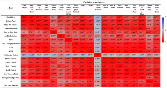 Correlation coefficient heatmap between evaluated traits. ns: No significant effect; *, ** and ***: Significant at 5%, 1% and 0.1% probability levels, respectively. AMF: Arbuscular mycorrhizal fungi; SPAD: Soil plant analysis development; NDVI: Normalized difference vegetation index; N: Nitrogen; and P: Phosphorus.