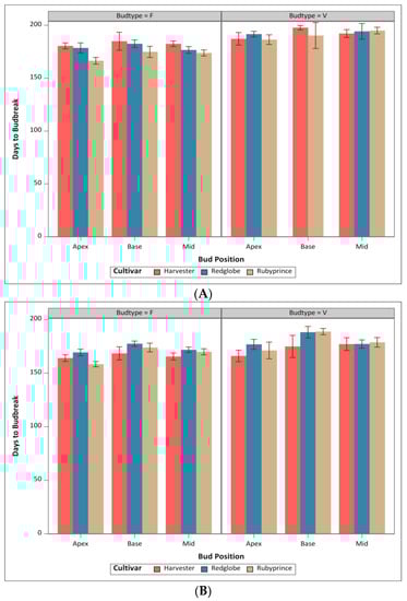 Number of days to reach budbreak for floral and vegetative buds by position (Apex, Base, and Mid) for “Harvester”, “Red Globe”, and “Rubyprince” cultivars. (A) Season 1 and (B) season 2.