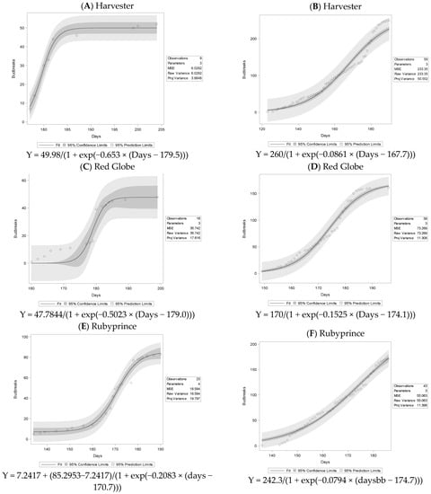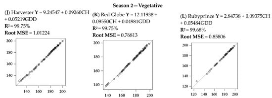 The dates and number of days necessary for the earliest and latest floral and vegetative budbreaks for each cultivar were obtained using the chilling hours model as well as the growing degree days model (Table 2). In general, “Rubyprince” was the earliest cultivar to release dormancy for season 1, and “Harvester” was the earliest for season 2. “Rubyprince” was the earliest cultivar in floral budbreak, followed by Red Globe and “Harvester” for season 1, while “Harvester” was the earliest, followed by “Rubyprince” and “Red Globe” for floral budbreak during season 2.