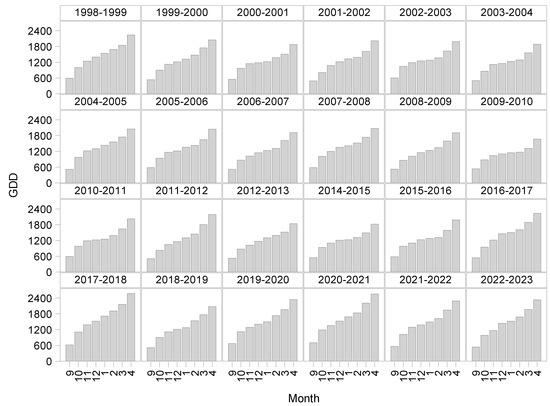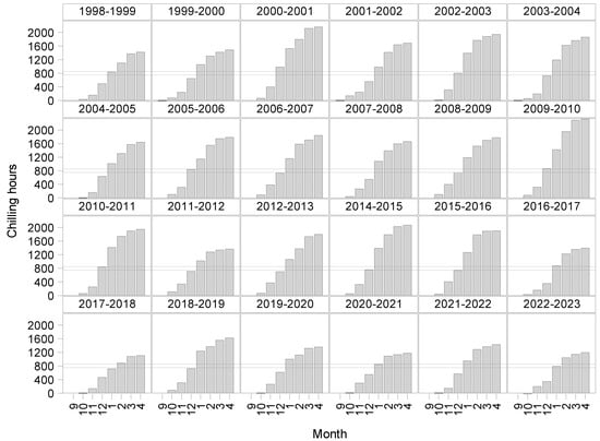 Chilling accumulation for 24 seasons was quantified starting from September to April from 1998 to 2023 to indicate the effect of climate variability using the chill requirements referenced [12] ranging from 750 to 850 (horizontal lines) for the cultivars evaluated (Figure 3). We observed that every year the chill requirements were fulfilled, even though there were some early (January) or late (February) completions. In the same way, the GDD accumulation was conducted for 24 seasons from 1998 to 2023, starting from September to April (Figure 4), to display the effect of warm temperatures accumulated during the same period.