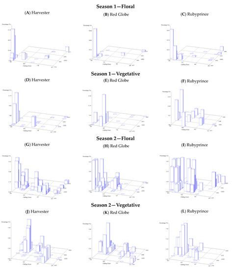 Chilling can be quantified as chill hours [40] and chill units (that allow for partial chill-hour accumulation and chill negation) [41]. Chill hours refer to the number of hours of low temperature within a specific range that regulates growth in processes such as dormancy. The latter model was adapted according to varying climatic conditions for different locations [42,43,44,45].