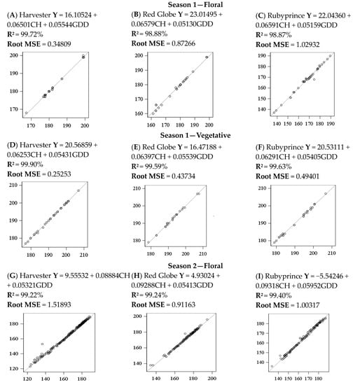 The adjusted models were evaluated by the coefficient of determination (R2), the root mean square error (RSME), and the line 1:1 for observed vs. predicted values for each cultivar and both seasons for floral and vegetative budbreak. As an example, the Weinberger model adequately fitted the prediction; R-square was above 98% for all the seasons, types of budbreak, and cultivars evaluated. The root means square error (RMSE) varied between 0.34 and 1.02 days for floral budbreak for season 1 and 0.91- and 1.51 days for season 2. For vegetative, the RMSR varied from 0.25 to 0.49 days for season 1 and 0.76 to 1.01 days for season 2.