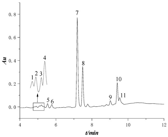 Representative UPLC chromatogram showing the 11 diterpenoids extracted from tobacco glandular trichome secretions. (Numbers 1–11 indicate the Peak1–11).