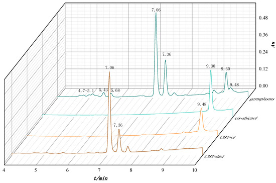 Air/sun-cured tobacco germplasms are diverse and abundant in China and have advantages in the development and utilization of plant glandular trichome secretions [20]. In the present study, diterpenoids of the glandular trichome secretions of 80 air/sun-cured tobacco germplasms were identified and evaluated, and the composition and content of diterpenoids differed significantly among the germplasms. The content levels of the germplasms varied from several to several thousand folds [21]. The average CBT-diol content of the local air/sun-cured tobacco germplasms was the highest, and the average cis-abienol content of the introduced germplasms was the highest. However, the tobacco germplasms with the highest CBT-diol (X48) and cis-abienol (X40) contents were both local resources in China. In this study, we found that 10 germplasm resources rich in hydroperoxy-CBT-diol, α-CBT-diol, β-CBT-diol, cis-abienol, or CBT-ol are useful for the extraction of beneficial active ingredients or can provide germplasms for improving the glandular trichome secretions in high-quality tobacco breeding.