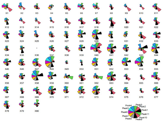 Star plots were constructed for the 80 air/sun-cured tobacco germplasms based on the composition and content of the 11 peaks (Figure 4). There were evident differences among the 80 glandular trichome secretions. Among them, the contents of CBT-diol in germplasms X48, X51, X54, X58, X63, and X73 were higher than those of the other germplasms. These included four local and two introduced germplasms, with local germplasm X48 showing the highest CBT-diol content. The contents of cis-abienol in germplasms X1, X9, X11, X32, X40, and X43 were higher than those of the other germplasms. These also included four introduced and two local germplasms, and the content of the local germplasm X43 was the highest. The diterpenoid content of X36, the breeding germplasm, was the lowest. There was no cis-abienol, and the content of CBT-diol was below the detection limit.