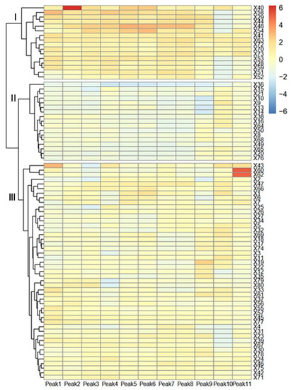 Table 6 illustrates the content of the 11 peaks of the three groups. The average contents of all diterpenoids were the highest in group I, except for Peak10 (cis-abienol), which was the lowest (278.58 μg/g). There were significant differences between group II and group III, except for Peak11 (CBT-ol). Group II had the lowest contents, except for Peak10 (cis-abienol), which had the highest average content (533.73 μg/g). The contents of all diterpenoids in group III were medium, and there were significant differences compared with group II, except for Peak10 (cis-abienol) and Peak11 (CBT-ol). Therefore, the germplasms in group I can be used for the integrated extraction of diterpenoid components, and those in group II can be used for the extraction of cis-abienol (Peak10). The germplasms in group III can be used for the extraction of plant fragrances as the components in equilibrium are good for enhancing the aroma and taste of cigarettes.