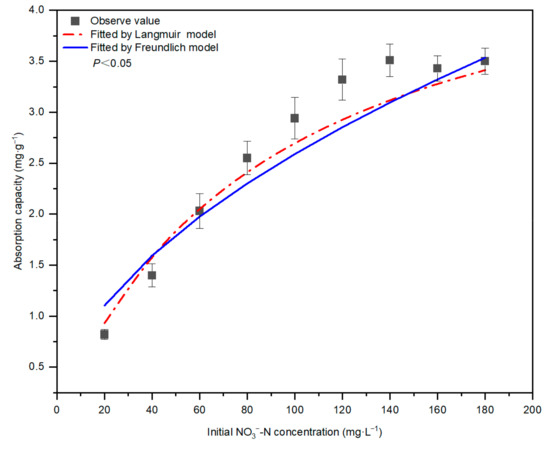 3.2.1. Absorption Isotherms of NO3−-N by Biochar