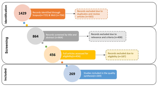 The search query generated 725 records through Scopus and 704 through WoS, with publication data containing information on the “Author, Title, Source”, “Abstract, Keyword, Addresses”, and “Cited, References and Use” categories, organized into fields. Moreover, by removing the repeated and review articles across the two selected databases, 864 articles were screened by title and abstract.