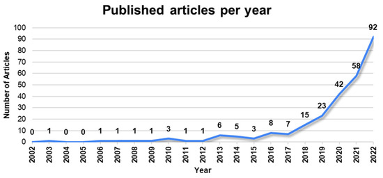 Number of publications per year throughout the period 2002 to 2022.