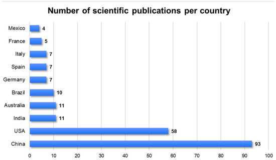 The most active country in terms of experiments for the whole period encompassed by this study is, clearly, China with over 93 publications. Following closely, the USA ranks second with 58 publications. India and Australia occupy the third and fourth positions, respectively, with 11 research studies each, while Brazil closely trails with 10 studies. In a more detached group, the majority then consists of European countries (Germany, Spain, Italy, France) with <8 publications.