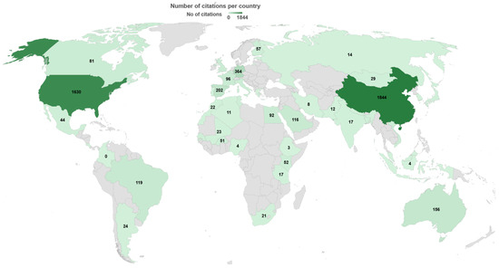The number of citations received is often used as a proxy for research quality. However, it should be noted that this metric alone may not provide a completely accurate representation, as various factors, including the research institute, the researchers’ country of origin, and the target audience, could influence citation counts [40]. Figure 4 illustrates the impact of research from different countries, and it becomes evident that China and the USA stand out, outperforming other countries in terms of citations. Notably, European countries, such as Germany and Spain, follow at a considerable distance with less than 370 citations, while Australia and Brazil are positioned further down the ranking. It is essential to highlight that these rankings are based on the currently available information and may be subject to updates as more recent citations become accessible, potentially influencing the relative positions of the countries in the future.