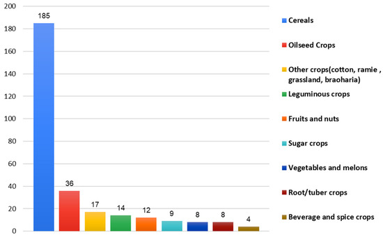 Wheat (including durum wheat), maize, and rice emerge as highly studied crops, not only within the cereal category, but also overall. Additionally, oilseed crops, with soybeans leading the way, also receive significant attention in scientific publications. On the other hand, the fruits and nuts category along with vegetables and melons appeared to be the least researched category in terms of publications. It is noted that the category “Grass crops” comprises various crops, including Bachiaria pastures, Grassland, Miscanthus, perennial bioenergy grass, and ryegrass. Similarly, the category of “tomato” also includes research on processing tomato crops (Figure 6).