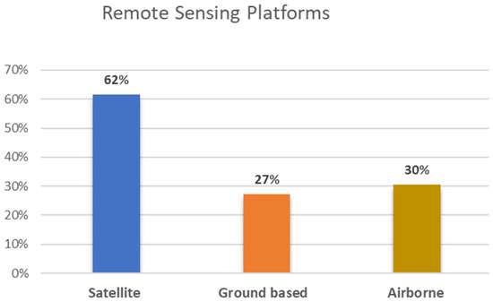 Summarizing the results, researchers primarily utilized satellite platforms to acquire the necessary data for their studies. Satellites, compared to the rest of the platforms, can cover large areas and provide high temporal resolution, while being cost effective [47]. Moreover, satellites can be used in multisource data integration, such as the integration of optical and SAR remote sensing [48]. These advantages can explain why the majority of the studies incorporated satellite remote sensing approaches.