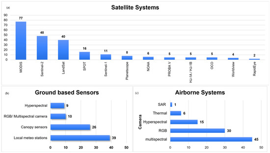 (a) Satellite platforms for yield forecasting used in the literature; (b) ground-based platforms for yield forecasting used in the literature; (c) airborne platforms for yield forecasting used in the literature.
