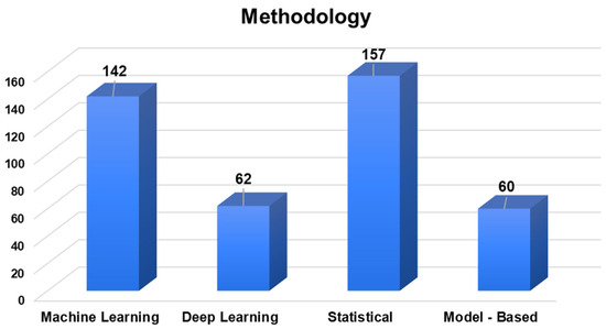 Based on the findings of this study (Figure 9), a statistical analysis is the most prevalent method employed for crop yield prediction in the reviewed studies. Following the statistical analysis, machine learning (ML) and deep learning (DL) methods are also widely used for yield estimation. In contrast, model-based approaches are observed to be utilized less frequently. Statistical analysis techniques often provide straightforward and interpretable relationships between variables, making them a popular choice for analyzing and understanding the impact of different factors on crop yields. Machine learning and deep learning methods, on the other hand, excel at capturing complex patterns and relationships in large and high-dimensional datasets, which is particularly advantageous when dealing with remote sensing data.