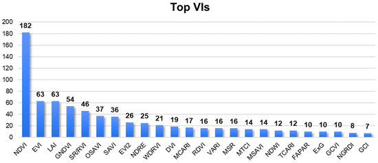 Among the numerous vegetation indices developed, several have gained widespread adoption due to their effectiveness and versatility. As indicated by the results (Figure 10), the Normalized Difference Vegetation Index (NDVI) emerges as the most commonly used Vegetation Index. This can be explained by the high correlation this index presented, with key yield variables such as above ground biomass, crop height, and Leaf Area Index (LAI) [67,68]. The NDVI is also the most well-documented spectral vegetation index in the literature, resulting in reliable and accurate estimates of crop health and productivity, which are crucial for yield prediction [69]. Following closely is the Enhanced Vegetation Index (EVI), an improved vegetation index that addresses some of the limitations of the NDVI, particularly in areas with dense vegetation or atmospheric interference. Additionally, the LAI and Green Normalized Difference Vegetation Index (GNDVI) are widely employed in the studies. Each index offers unique advantages and applications, depending on specific research or monitoring objectives. Researchers, agronomists, and environmental scientists rely on these indices to analyze vegetation dynamics, assess crop health, monitor land cover changes, and make informed management decisions.