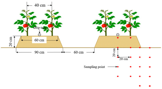 The local conventional variety “Qin ling Shu Yue” was selected for tomato cultivation. The planting method used was ridge cultivation with one ridge, two rows, and one strip. The ridge shoulder width was 60 cm, ridge height was 20 cm, and ridge spacing was 60 cm. Tomato seedlings were planted on both sides of the ridge with a row spacing of 30 × 40 cm. Drip irrigation was adopted using a drip tape with an inner flat emitter with a drip head spacing of 30 cm and a flow rate of 3.0 L·h−1. The total area of each plot was 250 m2, with dimensions of 4.2 m in length and 4 m in width, as shown in Figure 1.