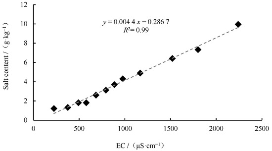 Moisture content in the soil was assessed utilizing the following drying method: after each 24 h period of irrigation, soil samples were acquired utilizing a soil borer at distances of 0, 20, 40, and 60 cm from the drip tape, at depths of 10, 20, 40, 60, and 80 cm, respectively. Samples were collected during the flowering and fruiting periods (spring: 3 May, autumn: 28 October) and at the end of fruiting (spring: 3 July, autumn: 31 December) for analysis. Soil salinity was determined using the following conductivity method: sampling was carried out in each growth period of spring and autumn; dried soil samples were ground and sieved through a 20-mesh sieve, then a 5:1 water-to-soil ratio extract was made, and the electrical conductivity (EC) of the extract was measured using a portable conductivity meter (DDP-210). Subsequently, the connection between soil salinity and electrical conductivity was calibrated employing the drying method, enabling the calculation of soil salinity. The calibration outcomes are depicted in Figure 2.