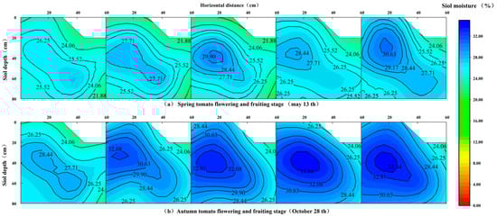 Figure 3 depicts the spatial distribution of soil moisture during the flowering stage of protected tomatoes in spring and autumn. The figure shows that the soil moisture in different treatments for the spring tomatoes gradually increases in the 0–40 cm soil layer while decreasing in the 40–80 cm layer, exhibiting a “high in the middle and low on both ends” pattern. The soil moisture primarily accumulates at a depth of 40 cm. Horizontally, there is an observable pattern of initially increasing and subsequently decreasing with the distance from the drip irrigation tape. In all treatments, an elliptical wet area developed in the soil layer at a distance of 30–50 cm from the drip irrigation tape at a 20–40 cm depth. With the rise in salinity of the irrigation water, the wet area gradually expands away from the drip irrigation tape, and the soil moisture content within the wet area increases with elevated water salinity. Compared with the CK treatment, the average soil moisture content of the T1 and T2 treatments decreased by 0.27% and 0.23%, respectively, while that of T3 and T4 treatments increased by 4.14% and 7.88%, respectively. The distribution pattern of soil moisture content for tomatoes planted in the autumn is similar to that in the spring, but continuous saline water irrigation further expands the wet area and significantly increases the soil moisture content compared to tomatoes planted in spring. The average soil moisture content of the T1–T4 treatments was higher than that of the CK treatment.