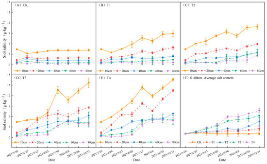 Figure 4 depicts the variation in soil salinity in different soil layers during the growth period under different irrigation salinities. The figure shows that the soil salinity generally decreases with increasing soil depth, with the salinity in the 0–20 cm layer is significantly higher than that in the 40–80 cm layer. With the passage of the growth period, the soil salinity in the 0–20 cm layer gradually increased following the various saline water irrigation treatments. In particular, for the T1–T4 treatments, the salinity in the 10 cm layer increased by 7.39%, 112.94%, 206.37%, and 222.90%, respectively, at the final stage compared to the initial stage after transplanting. The increase for the 20 cm layer was 95.10%, 256.22%, 417.52%, and 647.22%, indicating a more significant salt accumulation with increasing irrigation salinity. The soil salinity in the 40–80 cm layer showed no significant change for the T1 and T2 treatments during the growth period. However, for the T3 and T4 treatments, a significant increase was noted after the flowering and fruiting period. Specifically, at the final stage, the salinity increased by 620.01% and 680.62% in the 40 cm layer, 587.68% and 819.28% in the 40 cm and 60 cm layers, and 971.62% and 1043.97% in the 80 cm layer, respectively. Greater irrigation salinity corresponds to more pronounced salt accumulation in the deeper soil layers. Comparison of the average salinity in the 0–80 cm soil layers among different treatments showed a positive correlation between the soil salinity and irrigation mineralization. Compared to the CK treatment, the final average salinity in the T1−T4 treatments increased by 84.70%, 153.17%, 362.89%, and 480.79%, respectively, indicating significant salt accumulation.