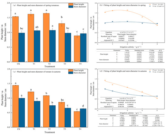 - The plant height and stem diameter of protected tomato planted in spring followed the order T2 > T1 > CK > T3 > T4. The cumulative dry matter decreased gradually with the increase in the irrigation water salinity level, with the order at the end of the growth stage being CK > T1 > T2 > T3 > T4. Generally, when the irrigation water salinity level was less than 4 g·L−1, it promoted tomato plant growth without significantly impacting dry matter. However, plant growth was inhibited when the salinity level exceeded 4 g·L−1. Appropriate salinity levels for saline water irrigation were beneficial for crop growth, while continuous saline water irrigation inhibited plant growth in all treatments.