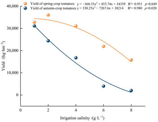 In Figure 6, the linear regression equation and the quadratic regression equation were established by taking the tomato yield as the dependent variable and the irrigation salinity as the independent variable. The fitting curve of spring crop yield and irrigation salinity was open downward parabolic distribution, the coefficient of determination was 0.951, and reached the peak at 2 g·L−1. However, the fitting curve of autumn crop yield and irrigation salinity was open upward parabolic distribution, the coefficient of determination was 0.980, and crops in the autumn season almost had no yield when the irrigation salinity was over 8 g·L−1. It was further indicated that the initial irrigation salinity of 2 g·L−1 saline water irrigation could significantly increase tomato yield, but continuous saline water irrigation would lead to yield reduction.