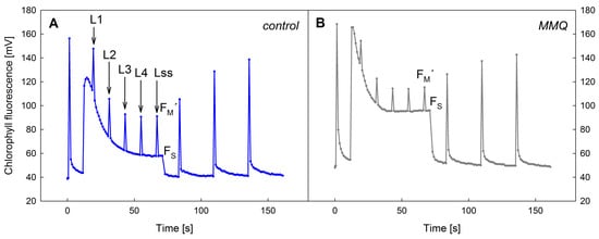 Record of chlorophyll fluorescence (Kautsky kinetics with saturation pulses) used for non-photochemical quenching (NPQ) evaluation presented for untreated control M. moschata plants ((A)—left) and those exposed to MMQ (Metamitron+Quinmerac) for 1 h ((B)—right). The arrows indicate maximum chlorophyll fluorescence levels (FM’—see Material and methods) reached after consecutive saturation pulses. The particular FM’ values were achieved after the application of particular saturation light pulses (L1 to Lss) and used for NPQ_L1, NPQ_L2, NPQ_L3, NPQ_L4, and NPQ_Lss calculation (see Figure 2). Note the MMQ-induced increase in overall chlorophyll fluorescence values throughout the Kautsky kinetics and the decrease in FM’ (relative to a steady-state chlorophyll fluorescence: FS) in MMQ-treated plants (B). These changes are indicative of negative effects in PSII.