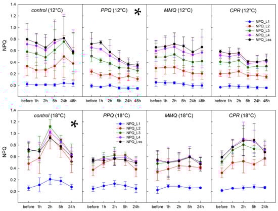 Effects of herbicide application (0–48 h) on non-photochemical quenching (NPQ) in plants grown in low (upper panel) and high (lower panel) temperatures. Data points are means of 5 replicates with standard deviation indicated. Abbreviations of herbicides: PPQ (Propaquizafop), MMQ (Metamitron + Quinmerac), CPR (Clopyralid). Statistically significant differences (alpha = 0.05) were found for the following parameters (*): 12 °C, PPQ: NPQ_Lss: before (b), 1 h (b), 2 h (ab), 5 h (ab); 18 °C, control: NPQ_L1: 2 h (b), 5 h (ab); NPQ_L2: 2 h (b), 5 h (ab); NPQ_L3: 2 h (b), 5 h (ab); NPQ_L4: before (ab), 1 h (ab), 2 h (b), 5 h (ab); NPQ_Lss: before (ab), 1 h (ab), 2 h (b), 5 h (ab), 24 h (ab), 48 h (ab).