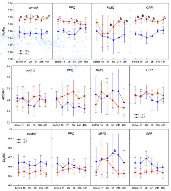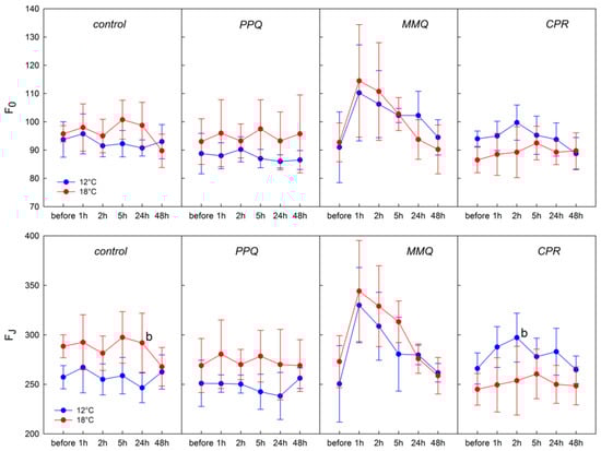 Effects of herbicide application (0–48 h) on selected chlorophyll fluorescence signals (F0—background chlorophyll fluorescence recorded at 0.01 μs, FJ—chlorophyll fluorescence signal recorded at 300 μs) derived from fast chlorophyll fluorescence transient (OJIP) in plants grown in low (blue symbols and lines) and high (red symbols and lines) temperature. Data points are means of 5 replicates with standard deviation indicated. Abbreviations of herbicides: PPQ (Propaquizafop), MMQ (Metamitron+Quinmerac), CPR (Clopyralid). Statistically significant differences (alpha = 0.05) are indicated by the letter b (the latter a is not shown).
