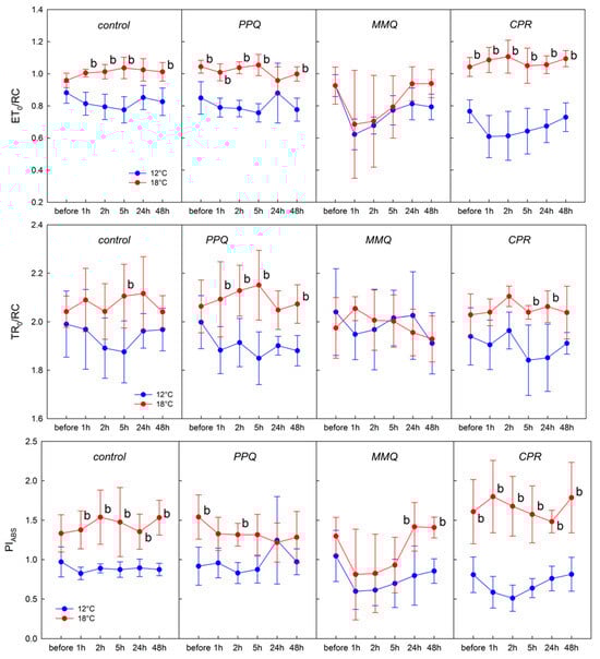 Effects of herbicide application (0–48 h) on the OJIP-derived chlorophyll fluorescence parameters: Photosynthetic electron transport rate per reaction center (ET0/RC), Trapping rate per reaction center (TR0/RC), and Performance Index (PIABS). Data points are means of 5 replicates with standard deviation indicated. Abbreviations of herbicides: PPQ (Propaquizafop), MMQ (Metamitron + Quinmerac), CPR (Clopyralid). Statistically significant differences (alpha = 0.05) are indicated by the letter b (the latter a is not shown).