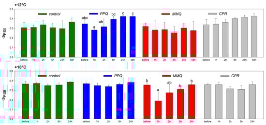 Effective quantum yield of photosynthetic processes in PSII (ϕPSII) for untreated control and the herbicides-affected plants of M. moschata. The plants were cultivated and exposed to PPQ (Propaquizafop), CPR (Clopyralid), and MMQ (Metamitron + Quinmerac) at low (12 °C) and high temperatures (18 °C). Statistically significant differences (alpha = 0.05) are indicated by the letters abc, ab, b, bc, c (the latter a is not shown in the three subpanels in the upper row, and the three subpanels of the lower row. In these subpanels, there is no statistical difference in ΦPSII values evaluated for control, and the particular time after a herbicide application).