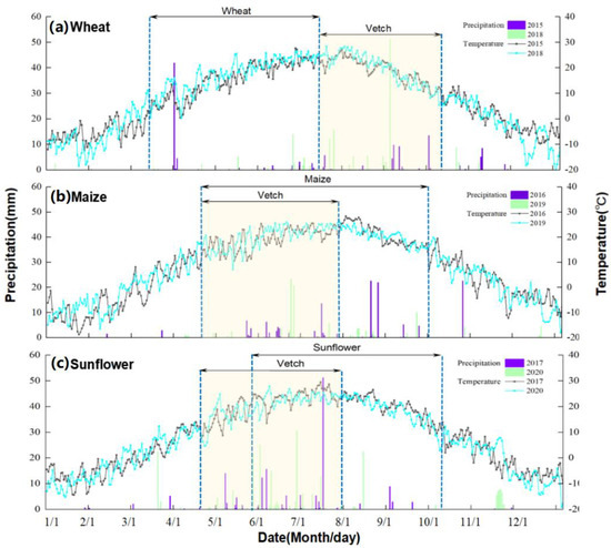 Daily precipitation (vertical bars) and mean air temperature (solid curves) in the spring wheat (a), maize (b), and sunflower (c) seasons. The growing periods of spring wheat, maize, sunflower, and vetch are labeled.