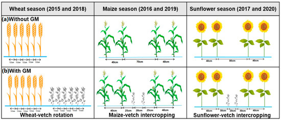 Graphic description of wheat–maize–sunflower rotation system with (b) and without (a) green manure planting. Vetch was sole-cropped after spring wheat harvest, while it was intercropped with maize and sunflower.