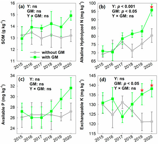 The soil nutrients of (a) organic matter (SOM), (b) alkaline hydrolyzed nitrogen (N), (c) available phosphorus (P), and (d) exchangeable potassium (K) contents with and without green manure (GM) in the six experimental years (Y). The p-values were obtained after two−way ANOVA for Y and GM, where ns indicates no significant differences. Values are means ± standard errors (n = 3). The red asterisks indicate significant differences at the p < 0.05 level with and without green manure (GM).