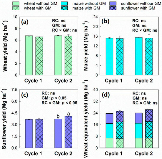 The grain yields (oven-dried) of (a) spring wheat, (b) maize, and (c) sunflower, as well as (d) the wheat equivalent yield of wheat−maize−sunflower rotation system with and without green manure (GM) in two rotation cycles (RCs). The p-values were obtained after a two−way ANOVA for RC and GM, where ns indicates no significant differences. Different lowercase letters mean significant differences with and without GM in each RC at p < 0.05 per Fisher’s least significant difference (LSD) test. Values are means ± standard errors (n = 3).
