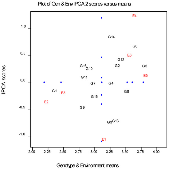 The AMMI models [14] were implemented using the GenStat (13th edition) statistical package [34], which is reliant on the first and second principal component (PC) scores—namely PC1 (representing the interaction of the first PCA) and PC2 (representing the interaction of the second PCA)—and calculated using the following equation, according to Purchase [13].