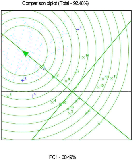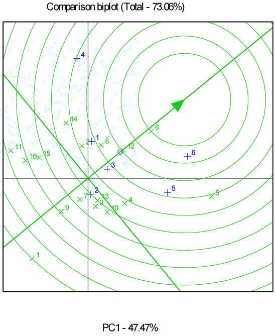 The results of the productivity of the genotypes in each environment are particularly interesting. In the case of E1 (low-yielding environment), G8 (4.31 ton.ha−1), G13 (4.13 ton.ha−1), and G3 (4.13 ton.ha−1) had the highest yields, but with no significant differences between them, while genotypes G1 (1.55 ton.ha−1) and G10 (2.15 ton.ha−1) recorded the lowest yields. In E2, an organic low-yielding environment, G13 (2.75 ton.ha−1), G1 (2.64 ton.ha−1), G5 (2.62 ton.ha−1), G2 (2.46 ton.ha−1), and G4 (4.40 ton.ha−1) gave the highest yields, with no statistically significant differences between them. The lowest grain yields were recorded for G6 (1.73 ton.ha−1) and G10 (1.84 ton.ha−1). In E3, a late-sowing low-yielding environment, G6 (3.08 ton.ha−1) had the highest grain production, with significant differences compared with all the other genotypes, followed by G3 (2.71 ton.ha−1) and G5 (2.67 ton.ha−1). Genotypes G1 (1.98 ton.ha) and G16 (1.98 ton.ha−1) recorded the lowest grain yields. In E4, a high-yielding environment, G14 had the highest grain production (5.27 ton.ha−1), with statistically significant differences compared with all the other genotypes, i.e., G2 (4.56 ton.ha−1), G6 (4.46 ton.ha−1), G11 (4.41 ton.ha−1), and G16 (4.31 ton.ha−1), followed by a very good performance and no statistically significant differences between them. In this environment, the lowest grain yields were recorded for G1 (2.27 ton.ha−1) and G9 (2.58 ton.ha−1). In E5, a high-yielding environment, G5 had the highest grain production (5.73 ton.ha−1), with statistically significant differences compared with all the other genotypes, i.e., G4 (4.62 ton.ha−1), G3 (4.43 ton.ha−1), G12 (4.30 ton.ha−1), G6 (4.10 ton.ha−1), and G2 (4.06 ton.ha−1), which had no statistically significant differences between them, while genotype G15 (2.43 ton.ha−1) had the lowest grain yield. Finally, in E6, a high-yielding environment, genotypes G5 (5.73 ton.ha−1), G6 (5.24 ton.ha−1), G12 (4.30 ton.ha−1), G10 (4.01 ton.ha−1), and G4 (3.96 ton.ha−1) recorded high grain yields, while genotypes G11 (2.12 ton.ha−1) and G1 (2.19 ton.ha−1) had low grain yields.