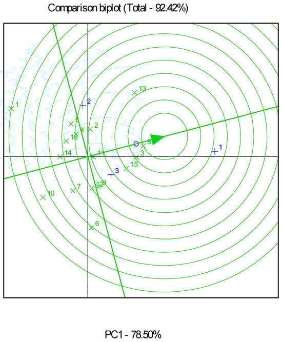 AMMI and GGE biplot analyses were used to visualize the results of the interactions between genotypes and environments. These analyses aim to identify varieties that perform above the average and are stable in multiple environments and, second, suggest using varieties with low stability in particular environments by exploiting their adaptability under specific environmental conditions [19]. The GGE biplot model [7,20] offers a comprehensive visual assessment of the entire genotype–environment interaction, presenting a biplot that encapsulates both average yield performance and stability. GGE effectively filters out the noise originating from the environmental main effect (E) and highlights the two crucial components: genotype effects (G) and G × E interactions. The genotype’s value is visually represented using scores obtained from principal component analysis. Genotypes positioned closer to the performance line are deemed more stable compared with those located farther away. Moreover, the model quantifies a genotype’s distance from the “ideal genotype”, which represents the one with the highest mean performance and absolute stability, effectively occupying the central position within a series of concentric cycles. Although such an ideal genotype is rarely found in practice, it is a reference point for evaluating genotypes. The concentric circles, centered on the ideal genotype, facilitate the visualization of the relative distances between all and ideal genotypes. The plot distance between any given genotype and the ideal genotype can be used to measure its desirability [7,20].