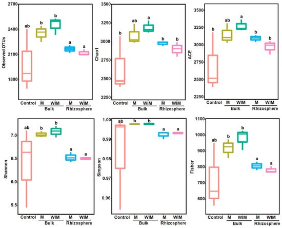 A total of 242,253 high-quality 16S rRNA gene sequences were obtained from all 15 soil samples after quality filtering, ranging from 11,734 to 20,872 reads per sample (mean = 16,163). Both M and WIM treatments increased bacterial richness and alpha diversity in soil compared to the control treatment, which were generally significantly higher in bulk soil than in rhizosphere soil (Figure 1). Respectively, 2453, 2355, 2167, 2121 and 1991 observed OTUs were identified in WIM_Bulk, M_Bulk, M_Rhizosphere, WIM_Rhizosphere and control soils (Figure 1). The number of observed OTUs was higher in both M and WIM treatments than that in the control treatment and was significantly higher in bulk soil than that in rhizosphere soil. Additionally, the highest bacterial Chao1, ACE, Shannon, and Fisher diversity indexes were recorded in WIM_Bulk soil, followed by those of M_Bulk, M_Rhizosphere, WIM_Rhizosphere and control soils (Figure 1). The bacterial alpha diversity was significantly higher in WIM_Bulk soil than in WIM_Rhizosphere soil, as was evident from the bacterial Chao1, ACE, Shannon and Fisher diversity indexes, and was significantly higher in M_Bulk soil than in M_Rhizosphere soil according to the bacterial Shannon, Simpson and Fisher diversity indexes (Figure 1).