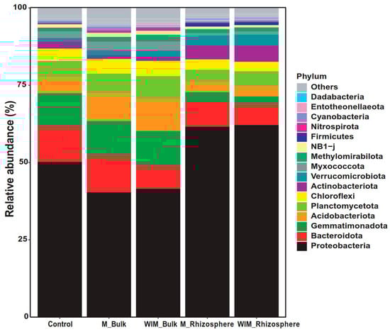 The rhizosphere and bulk soil samples of cotton in M and WIM treatments (0–20 cm; named M_Bulk, M_Rhizosphere, WIM_Bulk, and WIM_Rhizosphere, respectively), along with soil samples from the control treatment (0–20 cm; named Control), with three replicates per sample, were collected in August 2017 (at the flowering stage of cotton growth). Bulk soil was collected from plots without visible roots between two cotton plants (60 cm). For each sample, soil from five randomly selected plots was sieved through 2 mm meshes, fully mixed, and kept at −80 °C for DNA extraction and 4 °C or air dried for physicochemical analysis. Rhizosphere soil samples were collected using a previously reported method with some modifications [35,57]. After loose soil was removed from the surface of cotton roots, the roots were placed in a tube with 30 mL phosphate-buffered solution (pH 7.0) and shaken at 180 rpm for 30 min in a shaker. Then, the turbid solution was centrifuged at 10,000× g for 2 min after removal of the roots, and the precipitate was collected as a rhizosphere soil sample and stored at −80 °C for DNA extraction.