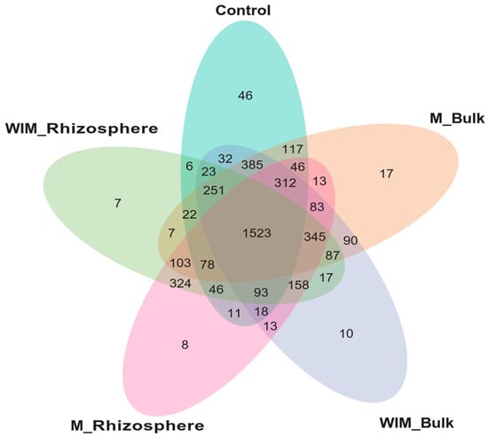 A total of 4291 bacterial OTUs were identified based on a 97% similarity level from 15 soil samples, of which 3479, 3440, 3174, 3090 and 3009 OTUs were from the M_Bulk, WIM_Bulk, M_Rhizosphere, WIM_Rhizosphere and control soil samples, respectively (Figure 3). A large proportion of OTUs were shared across M and WIM treatments, with 3076 OTUs in bulk soil and 2670 OTUs in rhizosphere soil, accounting for 80.04% and 74.29% of the total OTUs shared in M and WIM treatments, respectively (Figure 3 and Figure 4). Meanwhile, 403 OTUs and 364 OTUs accounting for 10.49% and 9.47% of the total OTUs in bulk soil were unique in M and WIM treatments, respectively, and 504 OTUs and 420 OTUs accounting for 14.02% and 11.69% of the total OTUs in rhizosphere soil were unique in M and WIM treatments, respectively (Figure 3 and Figure 4). In addition, 2503 OTUs in M treatment and 2497 OTUs in WIM treatment accounted for 60.31% and 61.91% of the total OTUs shared by bulk and rhizosphere soils, respectively (Figure 3 and Figure 4). Meanwhile, 976 OTUs and 671 OTUs accounting for 23.52% and 16.17% of the total OTUs in M treatment were unique in bulk and rhizosphere soils, respectively, and 943 OTUs and 593 OTUs accounting for 23.38% and 14.70% of the total OTUs in WIM treatment were unique in the bulk and rhizosphere soils, respectively (Figure 3 and Figure 4).