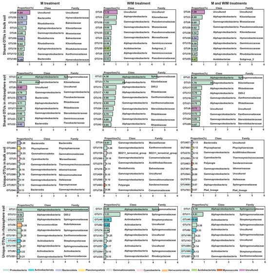 The distribution of shared and unique OTUs in the top 10 proportions of bacterial taxa in bulk and rhizosphere soils was analyzed (Figure 4). Among the shared bacterial taxa OTUs in bulk and rhizosphere soils, either individually or together in M and WIM treatments, the total proportion of the 10 top predominant OTUs of Proteobacteria in rhizosphere soil was greatly increased compared to that in bulk soil (Figure 4). The predominant OTUs of bacterial taxa of the 10 top proportions, including OUT49, OUT82, OUT257, and OTU300, were identified as Actinobacteria at the class level or Streptomycetaceae at the family level of phylum Actinobacteriota, which were unique to rhizosphere soil (Figure 4). In addition, the other predominant bacterial taxa OTUs of the 10 top proportions were identified as Sphingomonadaceae of the phylum Proteobacteria, of which OUT1, OUT11, OUT74, OUT199, and OTU264 were unique to rhizosphere soil, except for OTU2 that was found in bulk and rhizosphere soils, and OTU900 was unique to bulk soil (Figure 4).