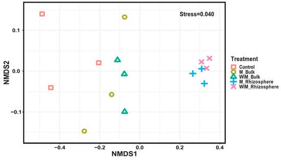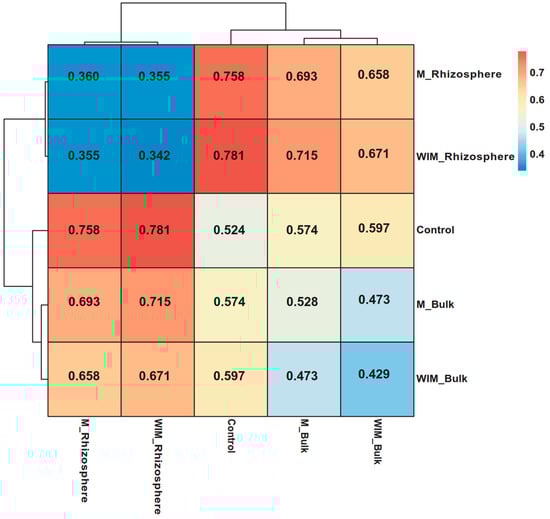 Non-metric multidimensional scaling and the Bray–Curtis dissimilarity analysis revealed that both M and WIM treatments changed the assemblage of the microbial community compared to that of the control (Figure 5 and Figure 6). The bacterial community in rhizosphere soil was assembled far from that in the control and bulk soils and behaved more specifically in rhizosphere soil than in bulk soil, and the difference between WIM and the control treatments was slightly higher than that between M and the control treatments (Figure 5 and Figure 6). Two-dimensional plots assessed by NMDS ordination based on the Bray–Curtis distance showed that the bacterial communities in the rhizosphere soils in M and WIM treatments clustered closely and were separate from those in bulk and control soils, whereas the bacterial communities in bulk and control soils were not clearly separated along the first axis (Figure 5). According to the Bray–Curtis dissimilarity of microbial communities in soil, higher dissimilarities in WIM_Bulk (0.597) and in WIM_Rhizosphere (0.781) were observed than those in M_Bulk (0.574) and in M_Rhizosphere (0.758) compared to that of the control, respectively, indicating that bacterial communities were influenced more by WIM treatment than by M treatment (Figure 6). In addition, the Bray–Curtis dissimilarity of soil microbial communities between rhizosphere and control soils was higher than that between bulk and control soils (Figure 6). Furthermore, the Bray–Curtis dissimilarity of microbial communities in bulk soils (M_Bulk and WIM_Bulk, 0.473) was higher than that in rhizosphere soils (M_Rhizosphere and WIM_Rhizosphere, 0.355), indicating that bacterial communities in bulk soil were influenced more by different amelioration practices than those in rhizosphere soil (Figure 6).