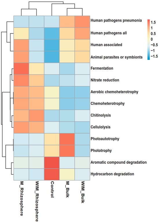 The ecological functions of bacterial communities in rhizosphere and bulk soils of cotton under the amelioration practices M and WIM, as well as in control soil, were predicted using the FAPROTAX database. A total of 92 categories were identified, and the top 14 categories with high relative abundance (>1%) are shown in a heatmap (Figure 7). The functional groups of hydrocarbon degradation and aromatic compound degradation were dominant in the control soil (Figure 7; Table S2). The functional groups, including fermentation, nitrate reduction, aerobic chemoheterotrophy, chemoheterotrophy, chitinolysis, and cellulolysis were significantly elevated in the rhizosphere soil after both M and WIM treatments, whereas the functional groups, including human pathogens pneumonia, human pathogens all, human associated, and animal parasites or symbionts were significantly increased in the bulk soil after both M and WIM treatments (Figure 7; Table S2). Moreover, the photoautotrophy and phototrophy groups decreased in the rhizosphere soil compared to the control soil and bulk soil after both M and WIM treatments (Figure 7; Table S2).