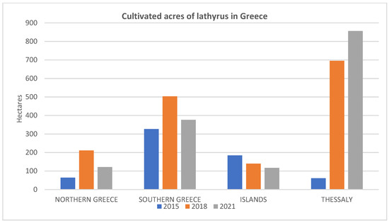 Total cultivated area of lathyrus in different parts of Greece (2015–2021) (ha). Source: Payment and Control Agency for Guidance and Guarantee Community Aid (OPEKEPE) (various years) [26].