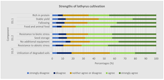 Figure 3 illustrates farmers’ attitudes regarding the strengths of lathyrus cultivation per component. The high protein content of lathyrus and its multiple uses—such as animal feed or as a crop used in rotation with other crops—were evaluated positively or very positively by about 70% of the farmers. The producers, considering that they also cultivate cereals, believe that adding a protein-rich multipurpose crop will contribute to food security. This is in line with other studies that recognize the role that legumes can play in food security and sustainable agriculture [31,32,33,34].