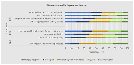 Weaknesses of lathyrus cultivation per Principal Component (D2.1: “Lack of Knowledge and Competitiveness”, D2.2: “Uncertainty”, D2.3: “Difficulty in harvesting”).